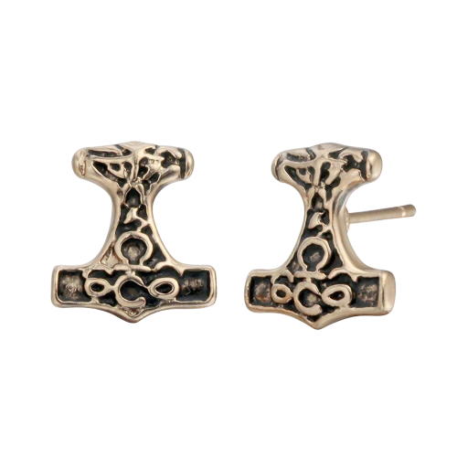 Ces boucles d’oreilles arborent fièrement le Mjöllnir, symbole de la force divine de Thor. Leur finition dorée apporte une élégance raffinée, faisant de ces bijoux un véritable accroche-regard.