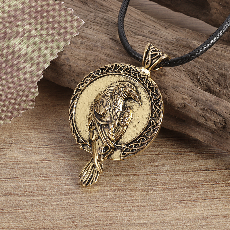 Ce Collier Viking Corbeau d’Odin Doré enveloppe celui qui le porte dans un manteau de majesté divine et de pouvoir.