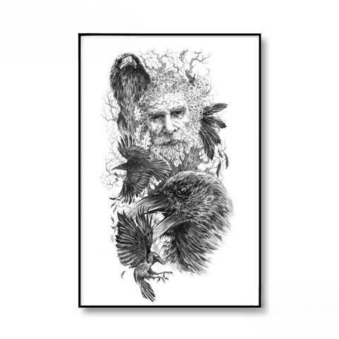 Sur cette toile de 60×40 cm, le contraste frappant entre le noir et le blanc crée un effet visuel captivant, mettant en valeur la grâce et la puissance du corbeau. Les détails minutieux et la représentation artistique reflètent la majesté de cet oiseau, souvent considéré comme un guide ou un messager dans la mythologie nordique.